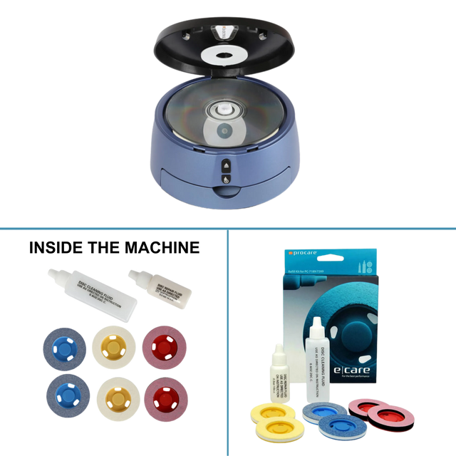 The Procare Professional Disc Cleaning & Repair Kit gives you the ability to remove smudges and fingerprints from your precious discs and restore and keep your important data or most precious memories. When unfortunate scratches occur, the PC-7189 will remove most surface damage and restore usability of your disc. A simple and easy to follow procedure repairs and polishes your CDs, VCDs, DVDs, CD