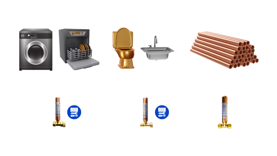 Featuring Lead-Free Copper Piston Arrestors seamlessly integrated with a variety of fittings, including threaded and compression tees. Tailored for versatility, the threaded tees are specifically designed for a direct fit into washing machines and dishwashers.