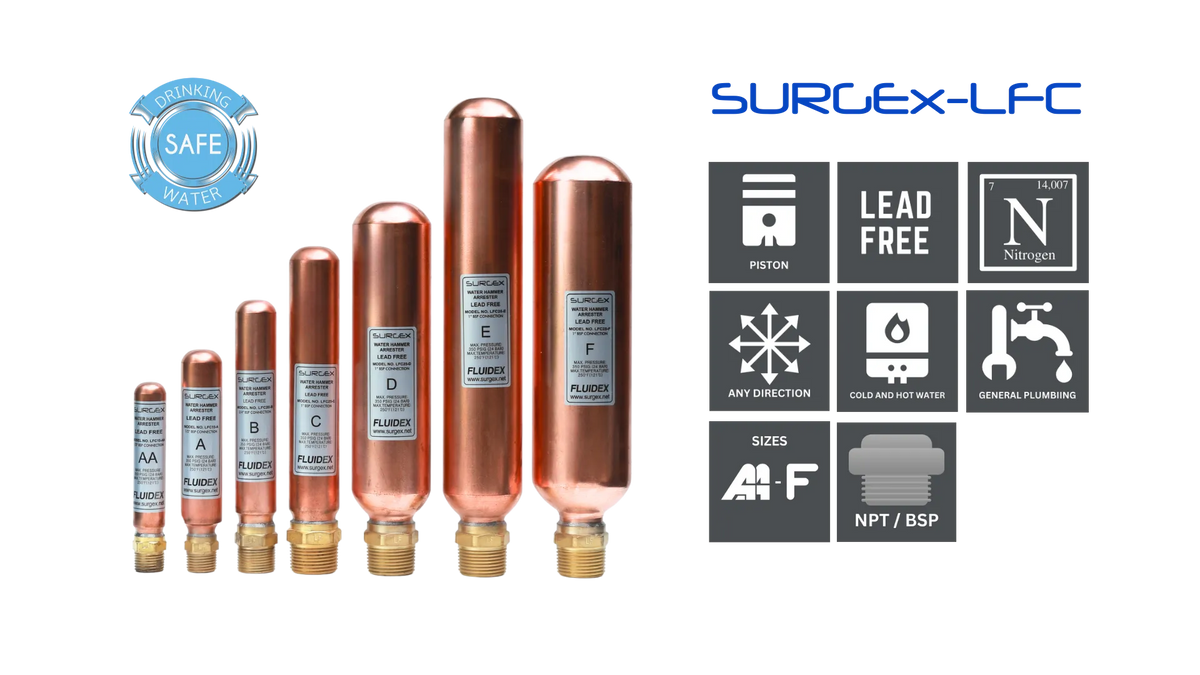 Crafted from seamless copper with lead-free brass connectors, the SURGEx-LFC series is engineered to swiftly counter water hammer effects.